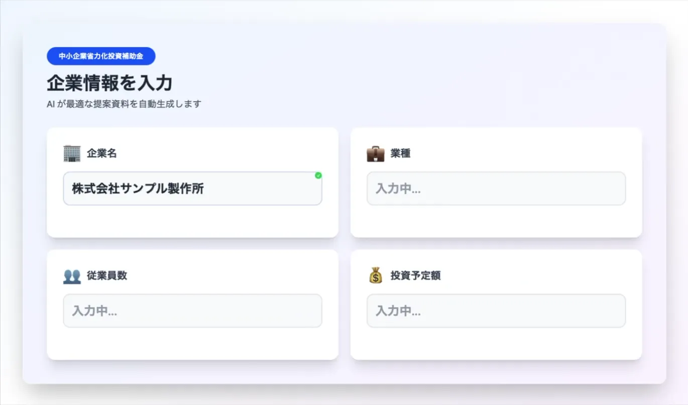 補助金の概要・申請要件・スケジュールをまとめた提案資料を自動生成。顧客説明の準備時間を大幅短縮。